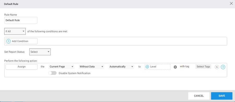 Set Report Status: This option enables users to set the status of reports based on the applied conditions. By default, the available conditions are "Open" and "Closed". Additional custom statuses can be configured using the "Custom Status" option in the user management settings.