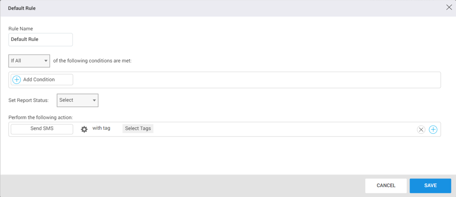 Add Action: This option allows users to define the Send SMS action to be executed based on the specified conditions.