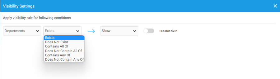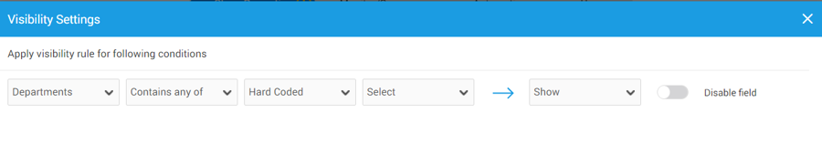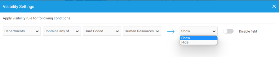 Once all the conditions are applied, the visibility of the field can be managed using the Show/Hide dropdown.
