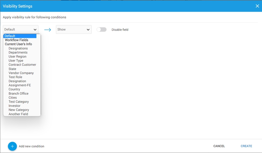 - Once all the conditions are applied, the visibility of the field can be managed using the Show/Hide dropdown.