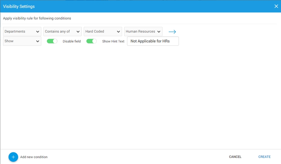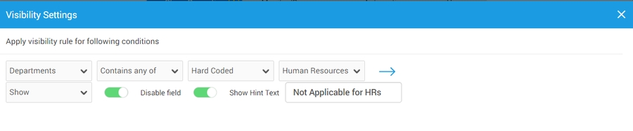 - Additionally, a field can be made visible but disabled by using the Disable Field toggle button. A hint text can be provided to explain why the field is disabled for the applied conditions.