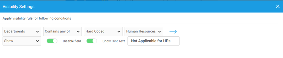 Additionally, a field can be made visible but disabled by using the Disable Field toggle button. A hint text can be provided to explain why the field is disabled for the applied conditions.