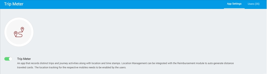 This app records trips and journey activities with location and time stamps using the app. Users can integrate location management with the Reimbursement module that enables auto-generation of distance travelled cards, requiring users to enable location tracking on their mobile devices.