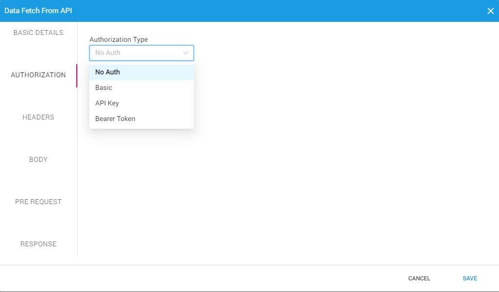 Authorization Type: This setting is utilized to configure the authorization details as No Auth, Basic, API Key, and Bearer Token.