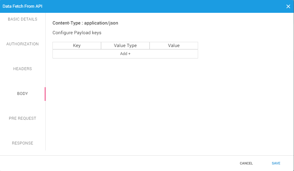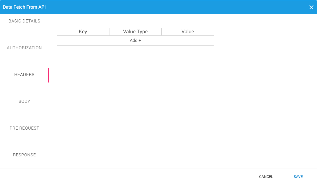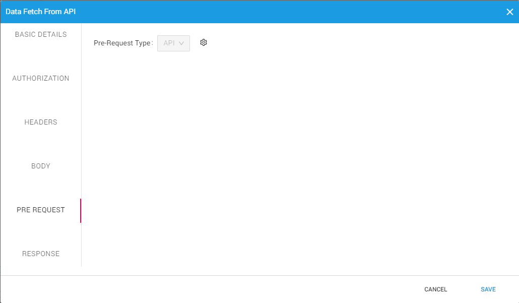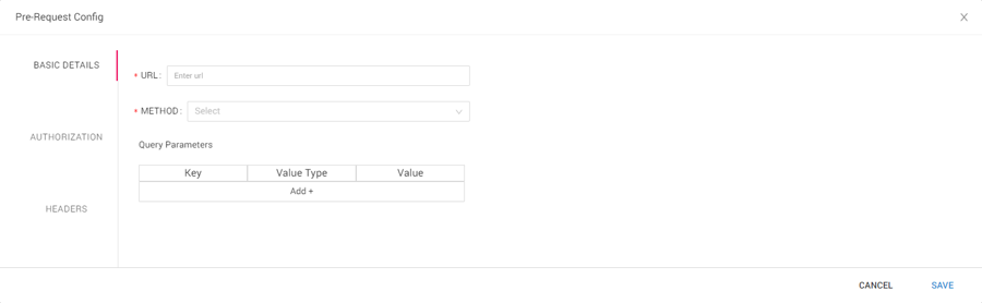 The Pre-Request can be further configured by clicking on the gear icon and defining the Basic details, Authorization, and Headers.