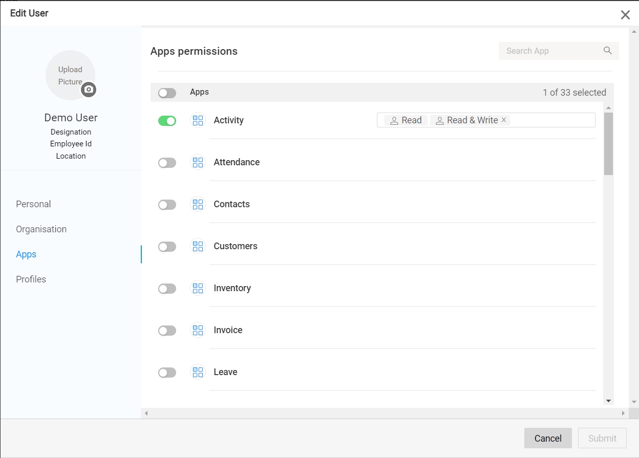 Toggle button can be used to assign or revoke app permissions fro a user.