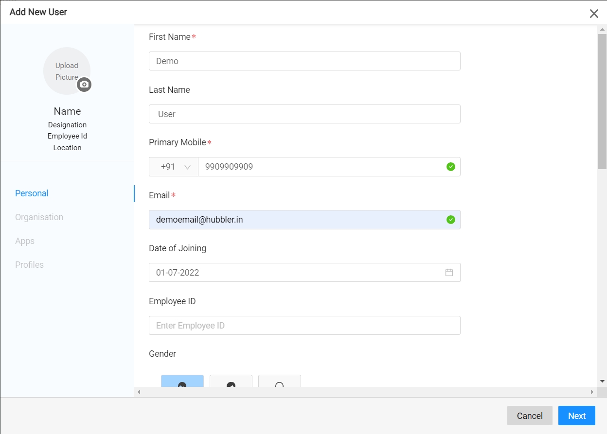 Date of Joining: Enter the user's date of joining the organization, capturing the information of when the user started their employment.
