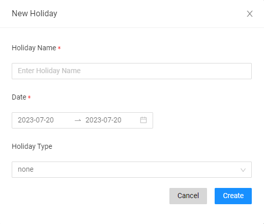 Click on "Create New Holiday" button to add a new holiday with the following details.