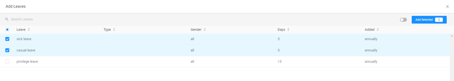Select the auto-popped up leave options and click on "Add Selected" to confirm the changes.